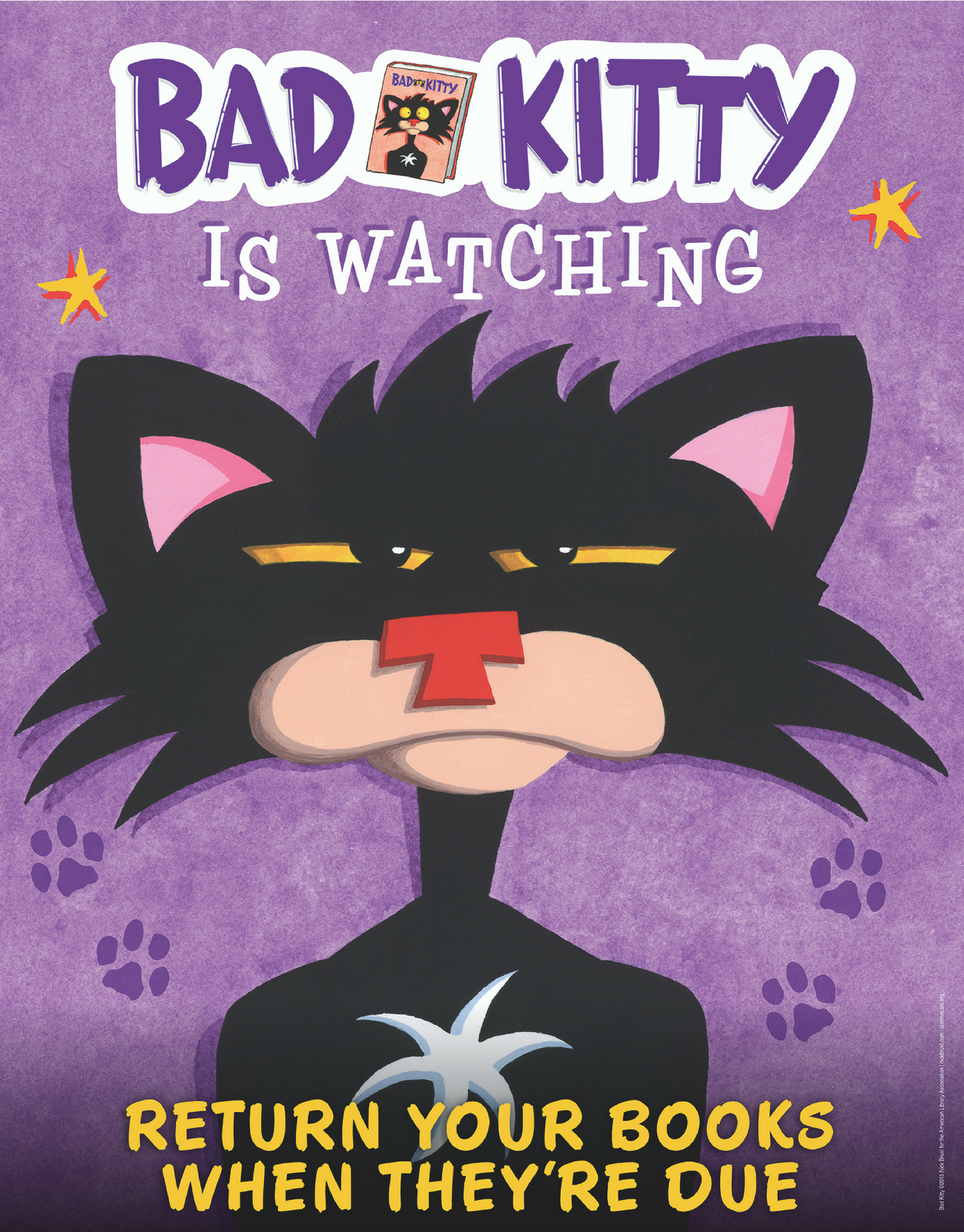 Bad Kitty's first poster with ALA Graphics taught kids how to care for library books—by showing them what NOT to do. In celebration of her tenth birthday in 2015 Bad Kitty makes her second poster appearance with another helpful reminder. Display this poster to encourage library visitors of all ages to return their materials on time—because Bad Kitty is watching! Special thanks to Nick Bruel and Neal Porter Books/Roaring Brook Press, an imprint of Macmillan Children's Publishing Group.