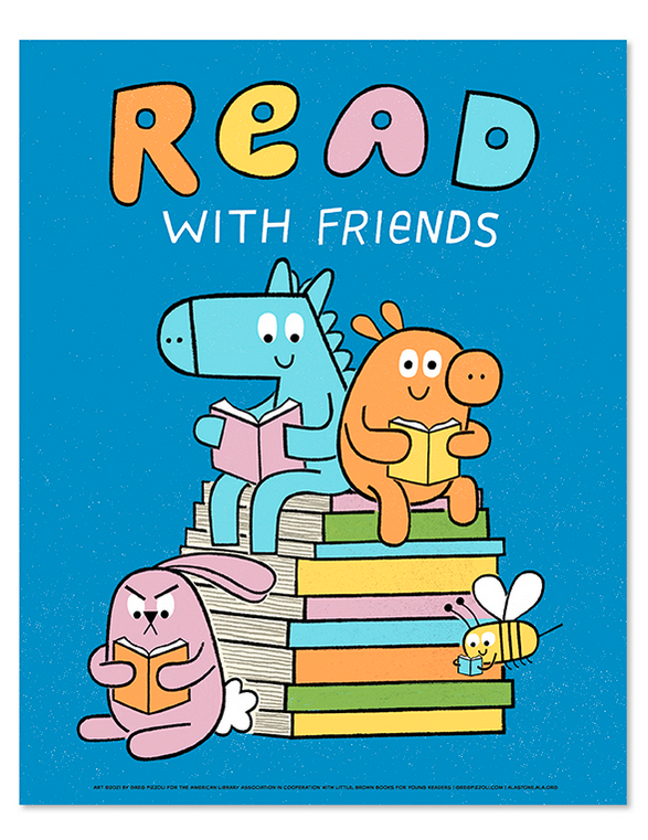 Baloney and his friends know the sky is the limit when you READ! In this new poster, the stars of Greg Pizzoli’s graphic novel series Baloney and Friends—Baloney, Peanut the horse, Bizz the bumblebee, and the always grumpy Krabbit—summit a mountain of books. These new items are inspired by book two in the series, Baloney and Friends: Going Up! In the latest, new readers will follow Baloney and his pals through adventurous mini-tales and mini-comics, such as when the friends experiment with a new device that lets them reach for the sky.