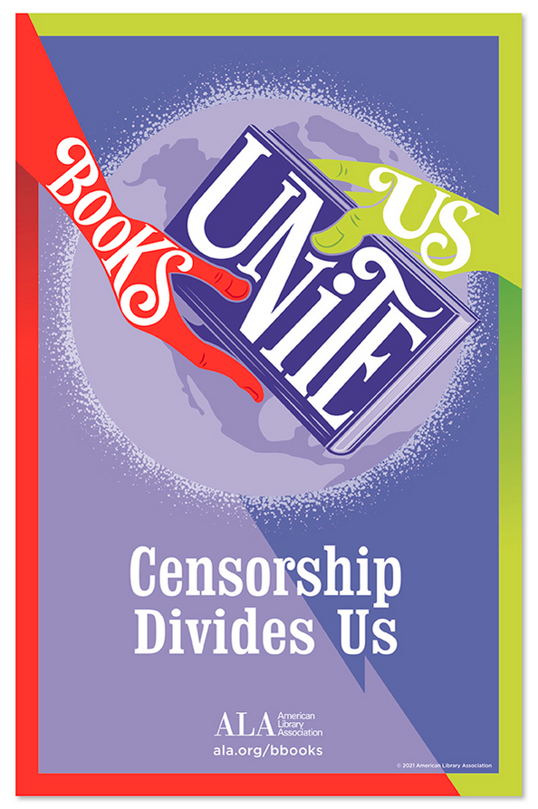 Banned Books Week is an annual event that celebrates the freedom to read. Learn more about this year’s theme—“Books Unite Us. Censorship Divides Us.”—and discover ways to incorporate this poster in your displays and programs at ala.org/bbooks.