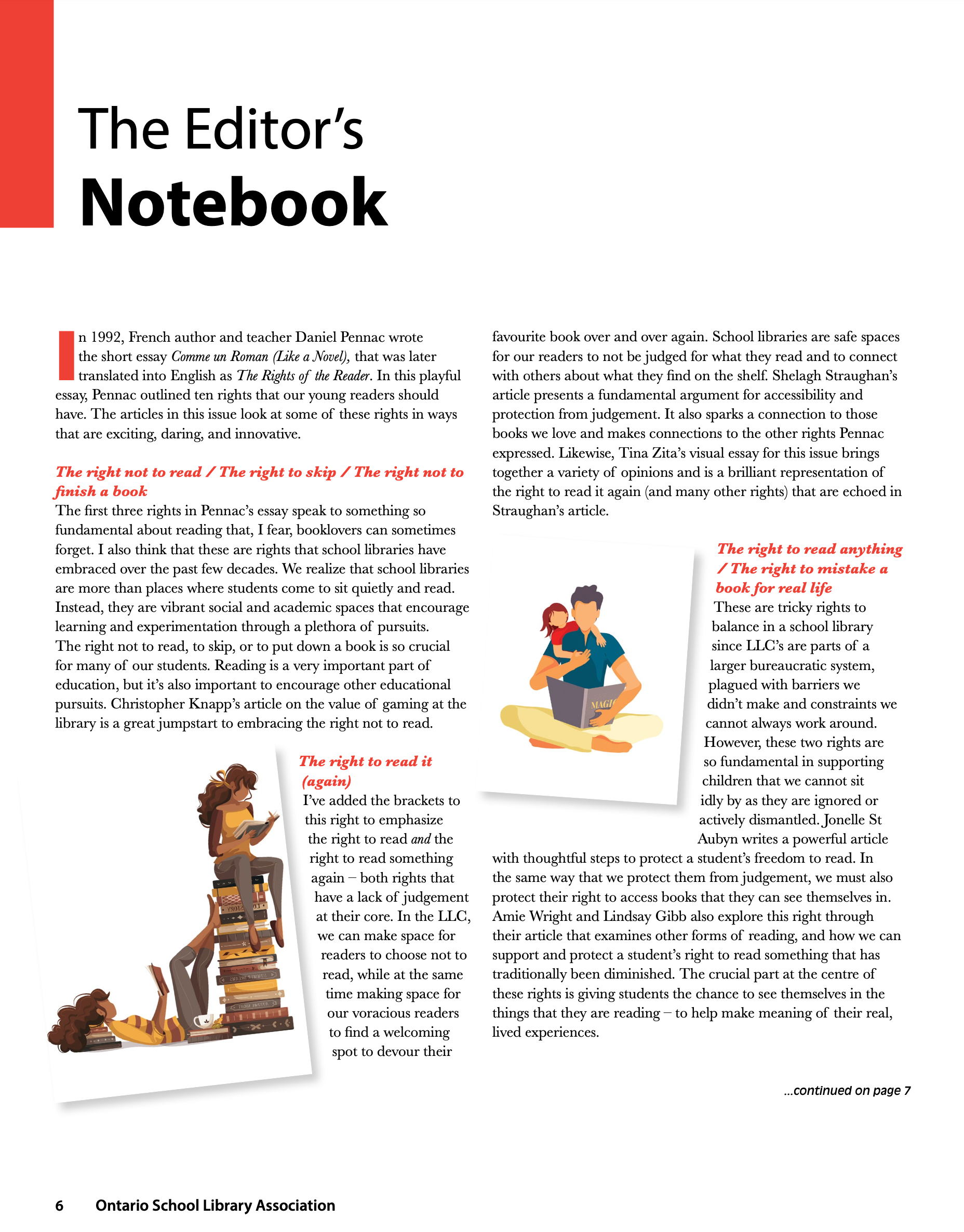 The Teaching Librarian is the official magazine of the Ontario School Library Association (OSLA). It is published three times a year to support OSLA members in providing significant and effective library programs and services. The Teaching Librarian also promotes library programs and curriculum development that furthers exemplary educational objectives. It fosters effective collaboration within the school library community and provides a forum to share experience and expertise.