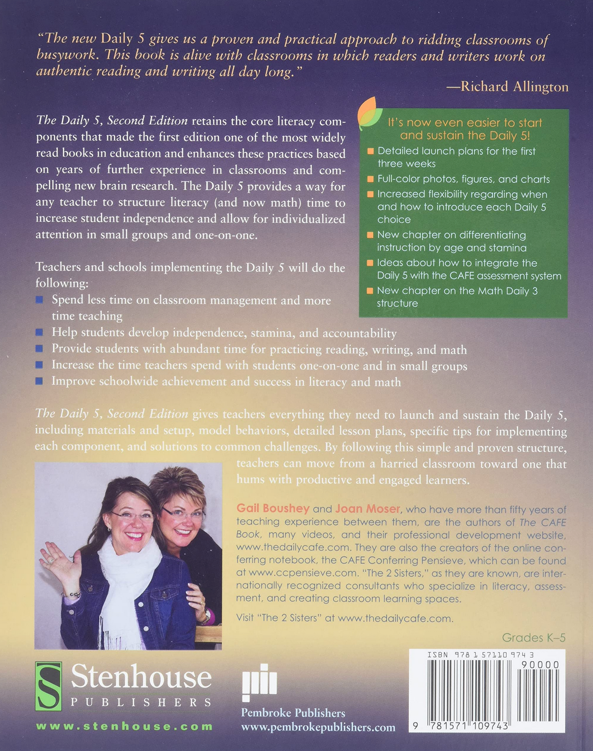The Daily 5 provides a way for any teacher to structure literacy time to increase student independence and allow for individualized attention in small groups and one-on-one. The Daily 5, 2/e retains the core literacy components that made the first edition one of the most widely read books in education and adds a wealth of new information, including detailed launch plans, full colour images, new information on differentiating by age and stamina, increased flexibility about how and when to introduce each Daily 5 choice, and a new chapter on the Math Daily 3. By following this simple and proven structure, teachers can move from a harried classroom toward one that hums with productive and engaged learners.