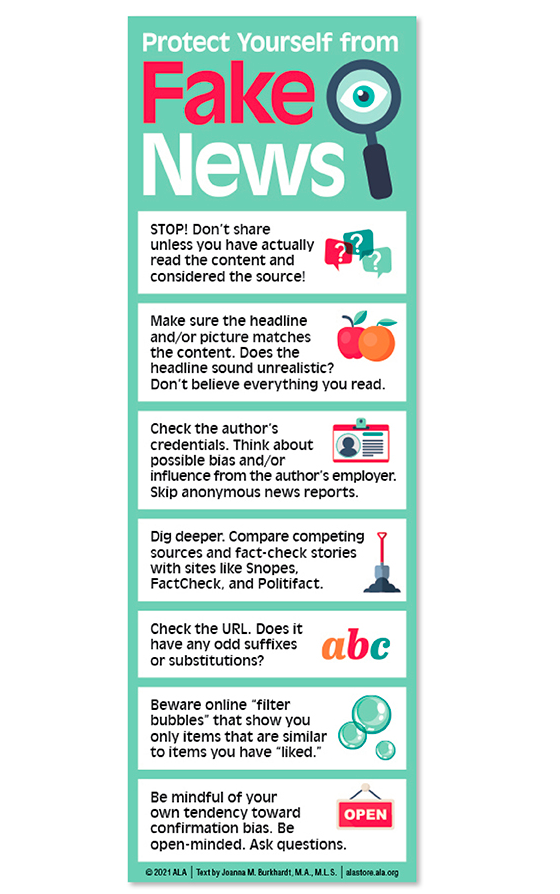 Help users weed out fake news stories and promote critical thinking with these helpful tips for evaluating information. With the proliferation of fake news today, these items show how users can examine social and news media more carefully to avoid hoaxes and misinformation.