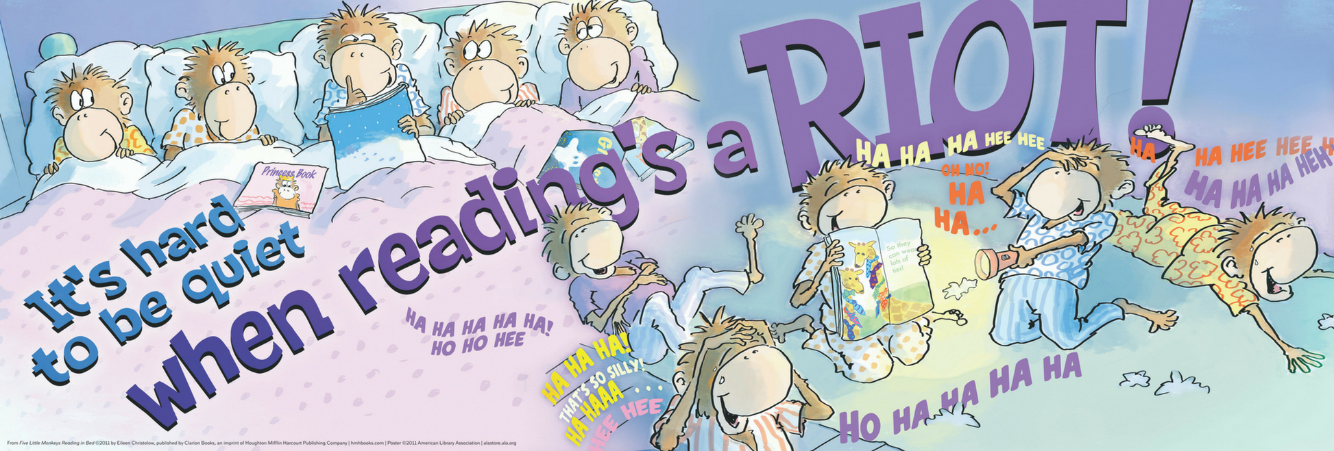 What happens when Five Little Monkeys read in bed? After their mama reads to them, it's bedtime for the Five Little Monkeys, but they can't resist reading just one more book! Five Little Monkeys Reading in Bed, the latest in the series by Eileen Christelow, focuses on reading for fun and making books part of a bedtime routine. This vibrant poster will appeal to kids and caregivers alike. Special thanks to Houghton Mifflin Harcourt.
