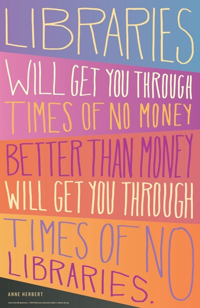 "Libraries will get you through times of no money better than money will get you through times of no libraries." Promote the power of libraries with this inspiring quote by American writer Anne Herbert (1950-2015).