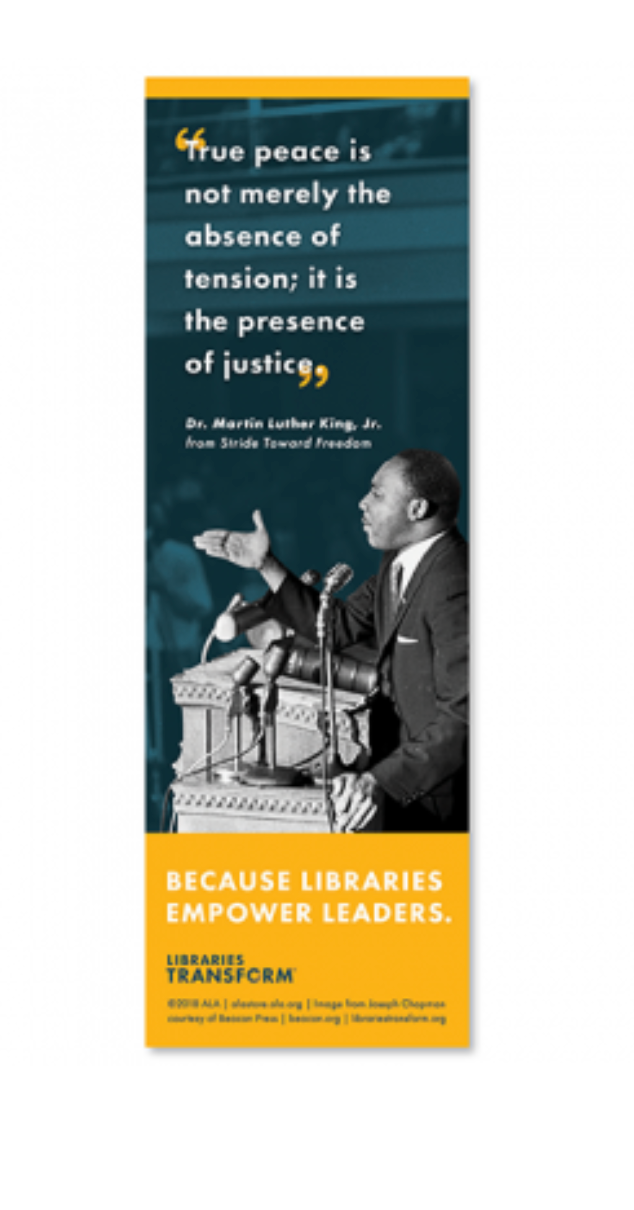 Dr. Martin Luther King, Jr., a Nobel Peace Prize laureate, fought discrimination through nonviolent resistance and helped transform a nation through his conviction of equality. Celebrate the legacy of Dr. King and show how libraries empower leaders with this bookmark. Special thanks to Beacon Press.