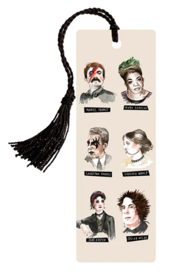This bookmark features some of your favorite authors, Marcel Proust, Maya Angelou, Langston Hughes, Virginia Woolf, Jane Austen, and Oscar Wilde, reimagined as punk rockers by illustrator Wendy MacNaughton.