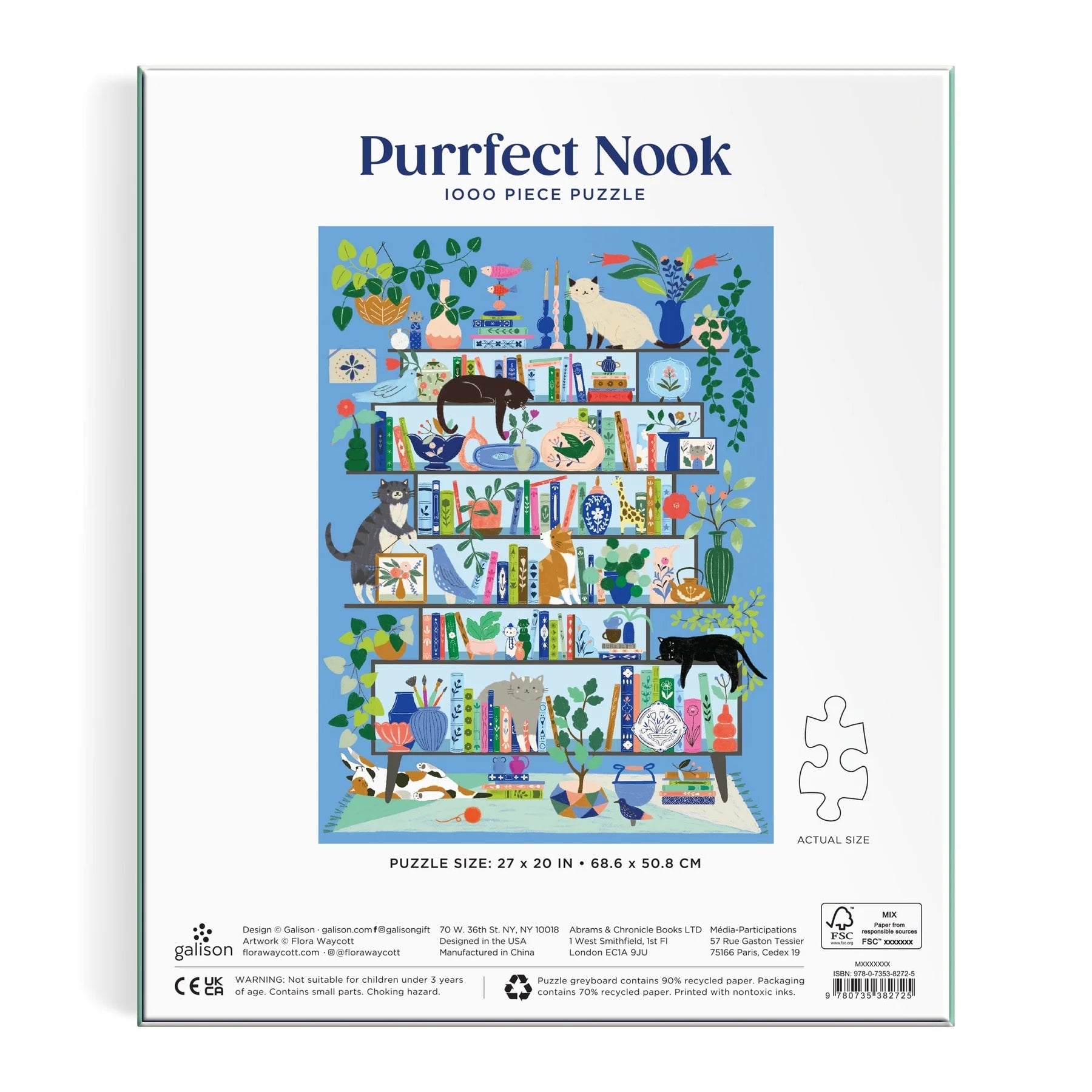 The Purrfect Nook 1000 Piece Puzzle by Flora Waycott showcases an inviting and charming shelfie, designed to appeal to bookworms, plant enthusiasts, and feline fans. The puzzle depicts a group of curious cats exploring a shelf adorned with a variety of intriguing and delightful novelties.