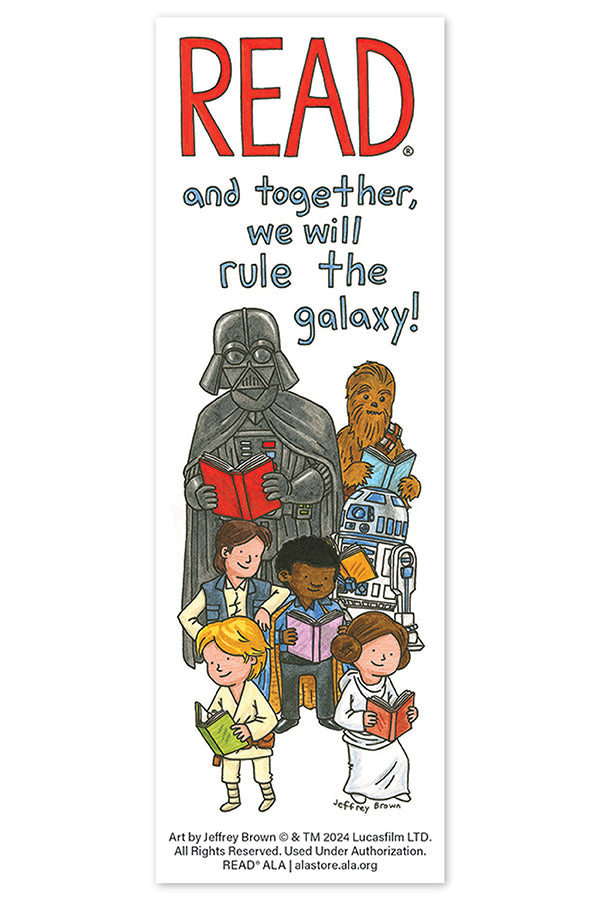 Star Wars fans of all ages—and especially little inter-galactic leaders and readers—will love this new bookmark featuring Darth Vader, family, and friends. With books in hand, Luke Skywalker, Princess Leia, Chewbacca, Lando Calrissian, Han Solo, and R2D2 gather around Darth Vader, and all agree that readers rule!