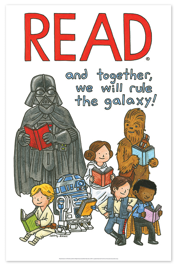 Star Wars fans of all ages—and especially little inter-galactic leaders and readers—will love this new poster featuring Darth Vader, family, and friends. With books in hand, Luke Skywalker, Princess Leia, Chewbacca, Lando Calrissian, Han Solo, and R2D2 gather around Darth Vader, and all agree that readers rule!