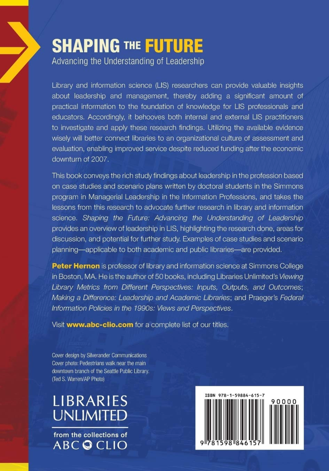 This book conveys the rich study findings about leadership in the profession based on case studies and scenario plans written by doctoral students in the Simmons program in Managerial Leadership in the Information Professions, and takes the lessons from this research to advocate further research in library and information science (LIS). Shaping the Future: Advancing the Understanding of Leadership provides an overview of leadership in LIS, highlighting the research done, the areas for discussion, and the potential for further study. Examples of case studies and scenario planning?applicable to both academic and public libraries?are provided.