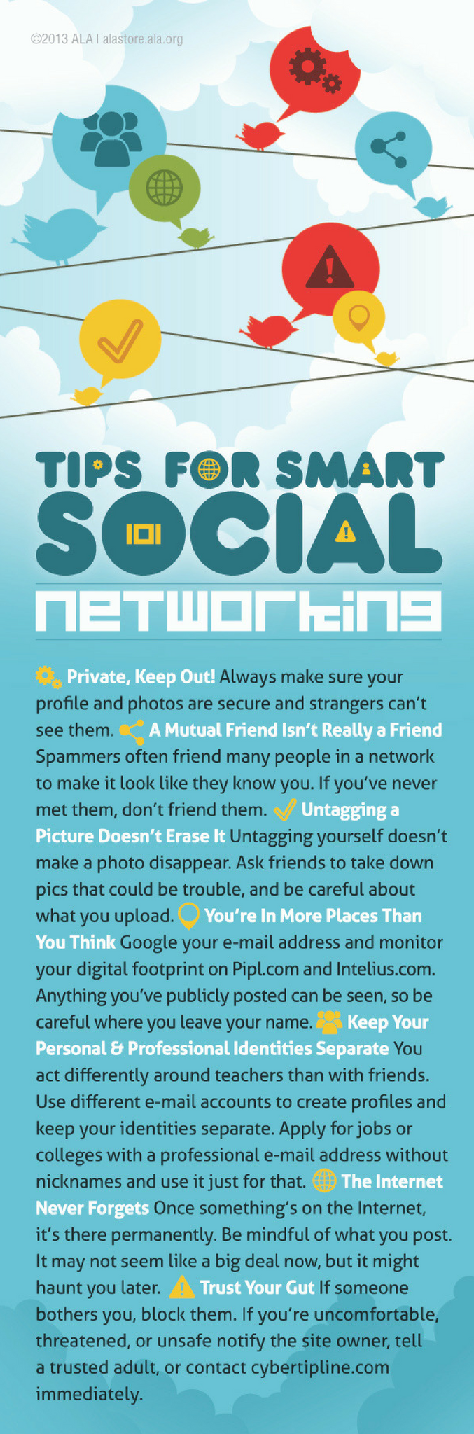 With strong teen-appeal, this bookmark encourages online safety. Written by YALSA's Teen Tech Week Committee.