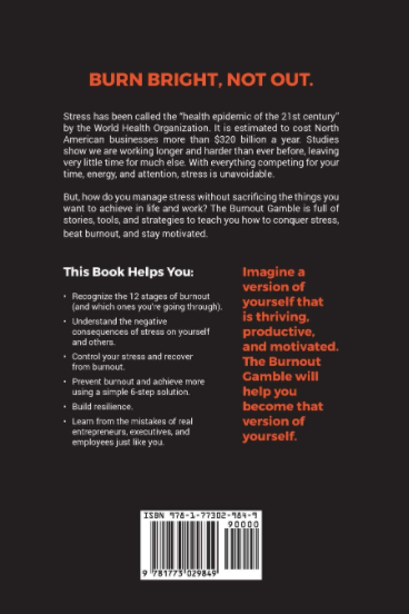 BURN BRIGHT, NOT OUT. Stress has been called the "Health Epidemic of the 21st Century" by the World Health Organization. It is estimated to cost North American businesses more than $320 billion a year, and studies show we are working longer and harder than ever before, leaving very little time for much else. With everything competing for your time, energy, and attention, stress is unavoidable. But how do you manage stress without sacrificing the things you want to achieve in life and work? The Burnout Gamble is full of stories, tools and strategies to teach you how to conquer stress, beat burnout, and stay motivated.
