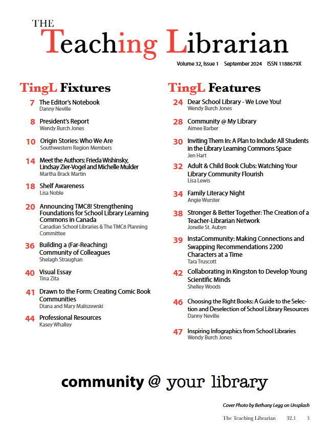 The Teaching Librarian is the official magazine of the Ontario School Library Association (OSLA). It is published three times a year to support OSLA members in providing significant and effective library programs and services. The Teaching Librarian also promotes library programs and curriculum development that furthers exemplary educational objectives. It fosters effective collaboration within the school library community and provides a forum to share experience and expertise.