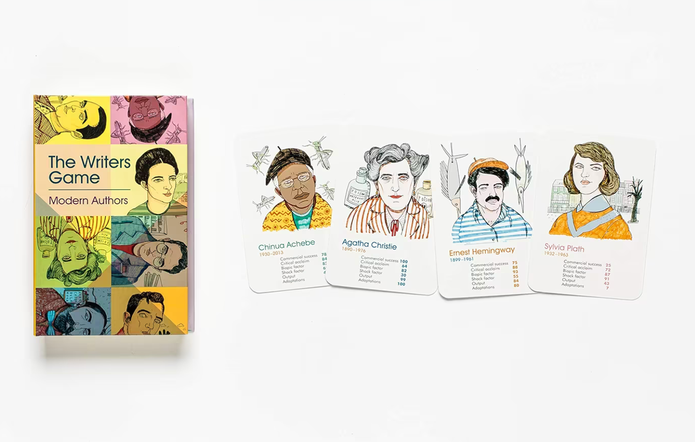 Who was the most published in their lifetime, Ernest Hemingway or Agatha Christie? Who was the most quotable, F. Scott Fitzgerland or Franz Kafka? Who courted the most scandal, Colette or James Joyce? Pit 32 of the greatest modern writers against each other with these beautifully illustrated cards.