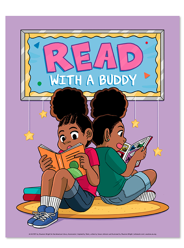 Reading with your buddy—or your twin sister, for that matter—is double the fun. This new poster, illustrated by Shannon Wright, features twins and best friends Maureen and Francine Carter from the graphic novel series Twins. Written by Coretta Scott King Honor author Varian Johnson, Twins follows the Carter sisters, who do everything together—at least until the start of sixth grade, when it seems like everything changes.