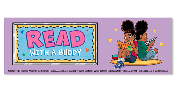 Reading with your buddy—or your twin sister, for that matter—is double the fun. This new bookmark, illustrated by Shannon Wright, features twins and best friends Maureen and Francine Carter from the graphic novel series Twins. Written by Coretta Scott King Honor author Varian Johnson, Twins follows the Carter sisters, who do everything together—at least until the start of sixth grade, when it seems like everything changes.