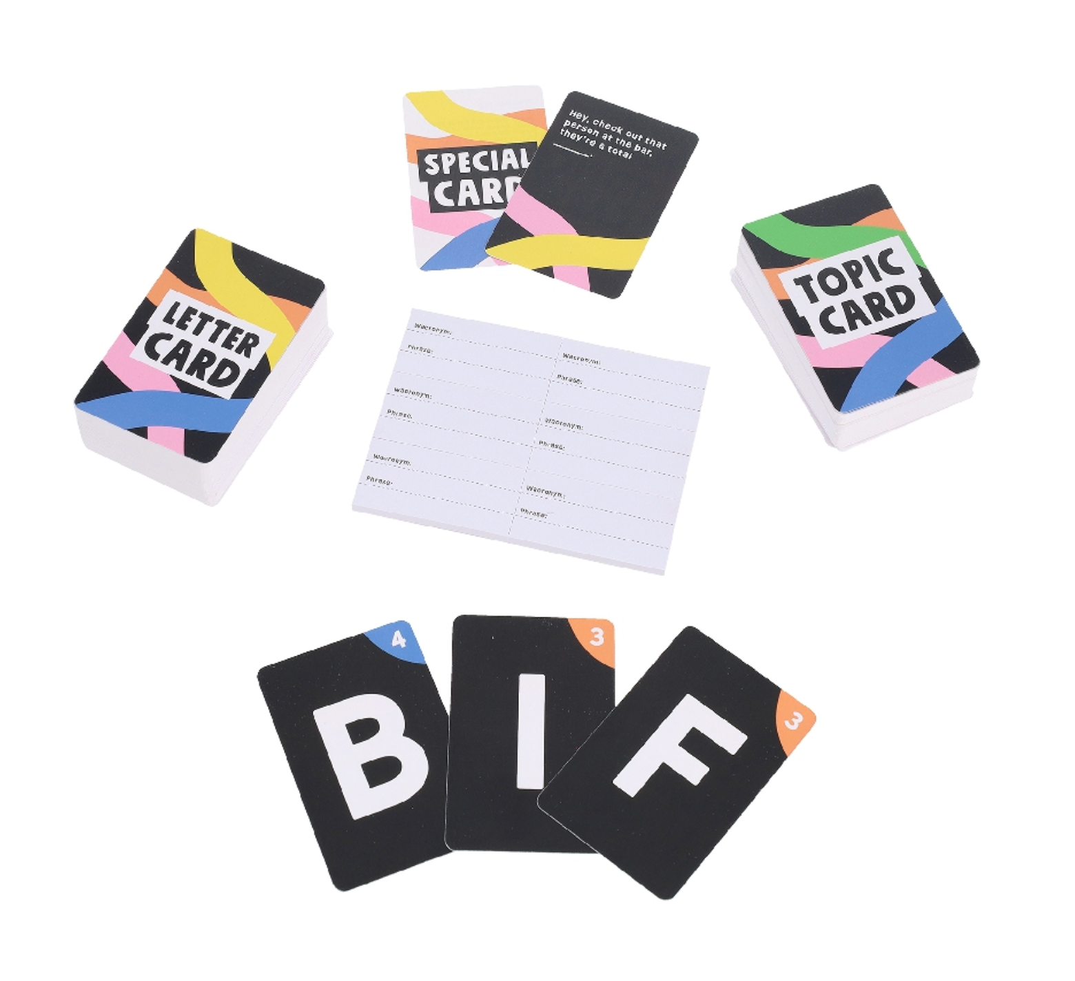 120 Topic cards, 94 Letter cards, 7 Special Round cards, 5 blank cards, answer pad, instructions